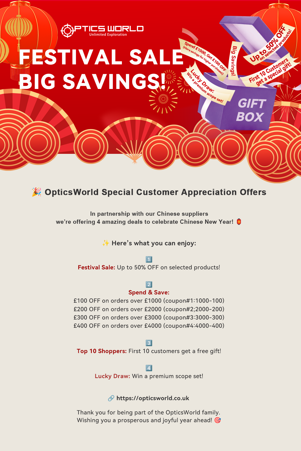 This Chinese New Year, OpticsWorld UK is enhancing the experience for our valued customers with 4 Exclusive Offers, in collaboration with our trusted Chinese suppliers. Take advantage of incredible savings and delightful surprises – all just in time for the festive season! 🏮