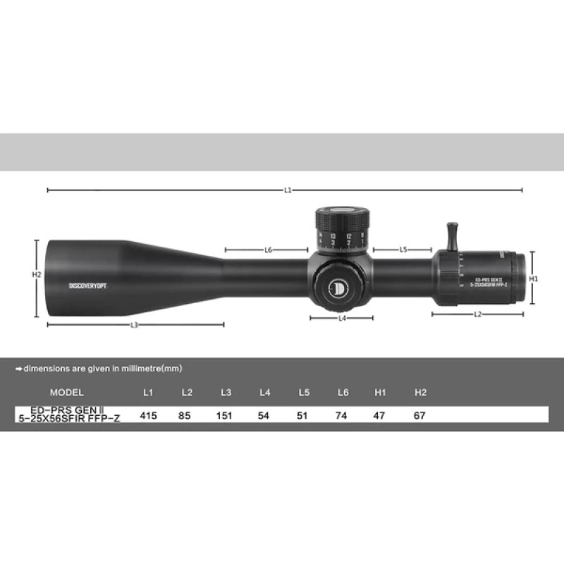 • The Discoveryopt 5-25x56 First Focal Plane riflescope offers 5-25x magnification for long distances and competitions. It features a 34mm tube for greater turret lift. The scope provides a 36 MRAD maximum height adjustment.