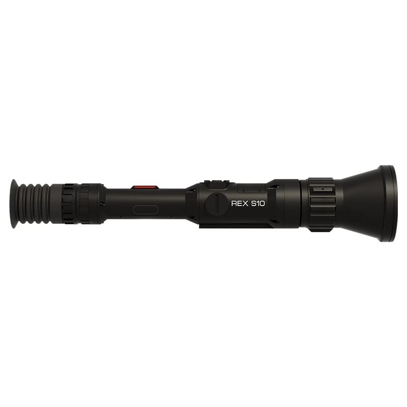 Up to 10 hours with a removable battery. The REX features a combined battery system with a single removable and rechargeable Li-ion battery. You could either recharge the battery or support your scope with an external power bank, providing additional time during the hunt.